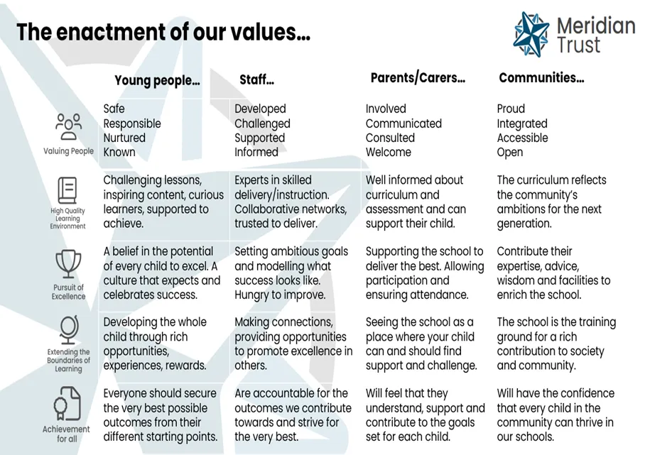 As part of the Meridian Trust family of schools, our core values are at the heart of everything that we do.